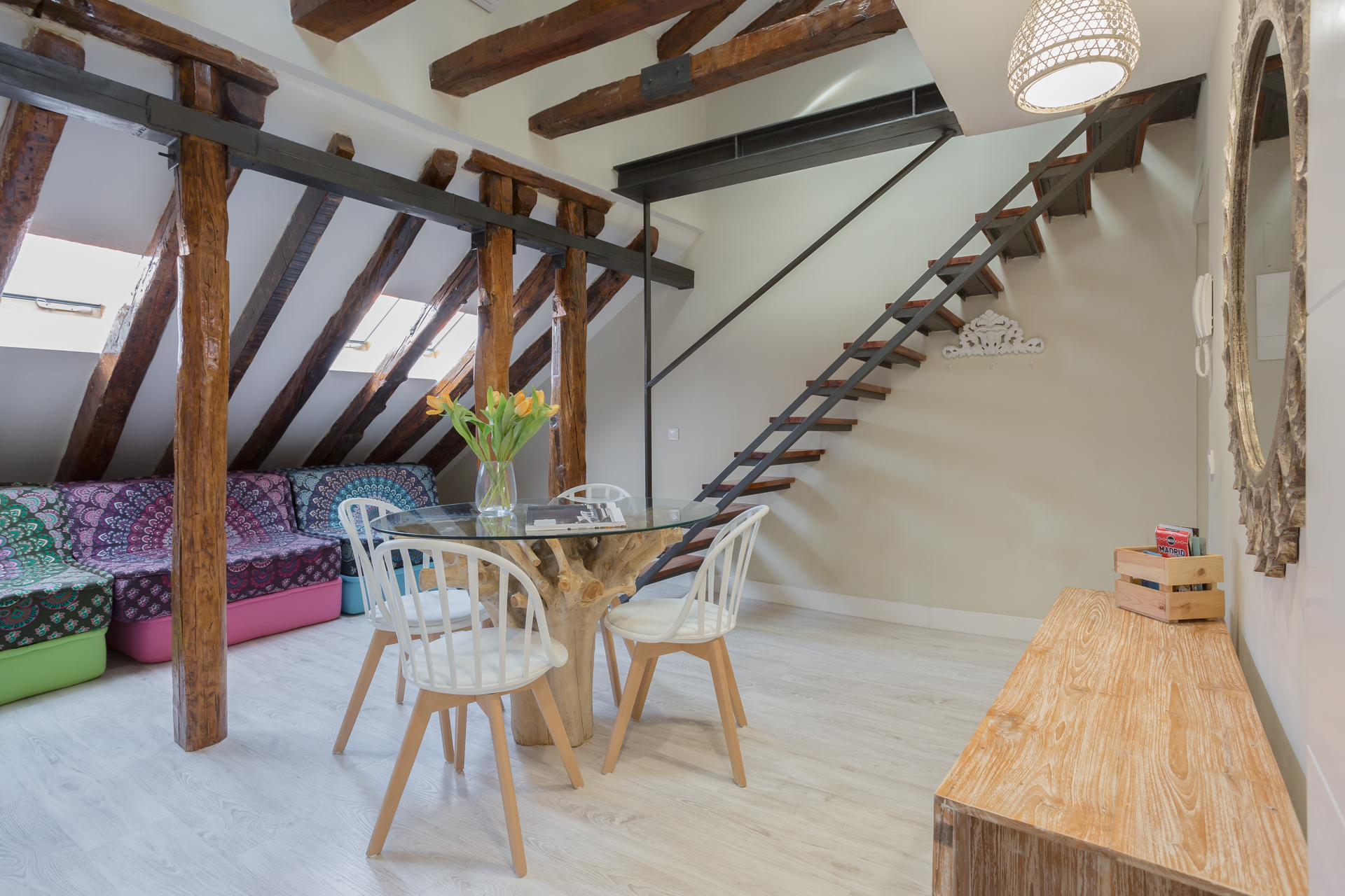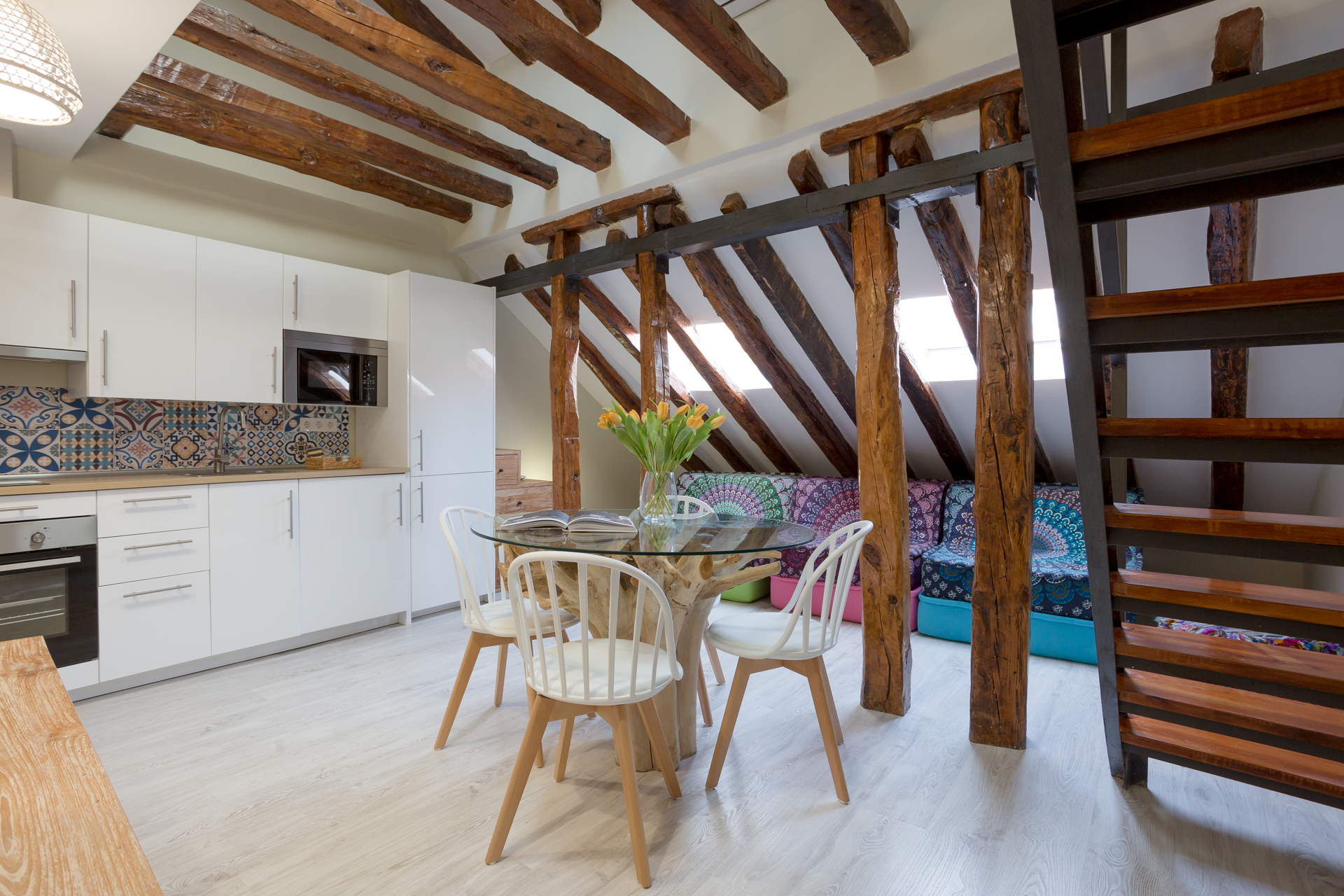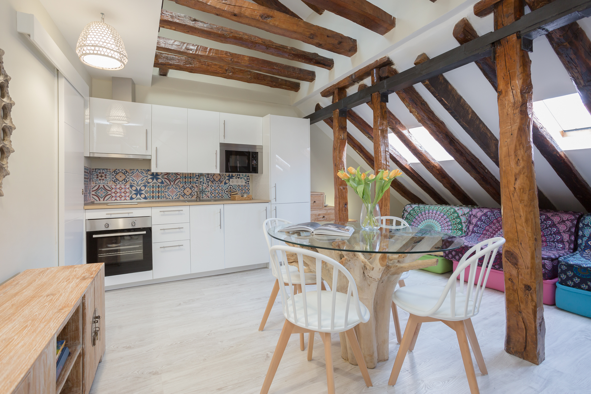 Ubicado en la última planta del edificio, este ático con toques de madera y superficies blancas que dan aires de amplitud y serenidad, está dividido en dos áreas. La zona del salón / comedor, que tiene un sofá de colores y una mesa de comedor con sillas de madera rústicas, que perfectamente contrastan con las vigas que se pueden observar alrededor. Junto a estos, se encuentra la cocina, y que contiene todo lo que pueda necesitar durante su estancia.