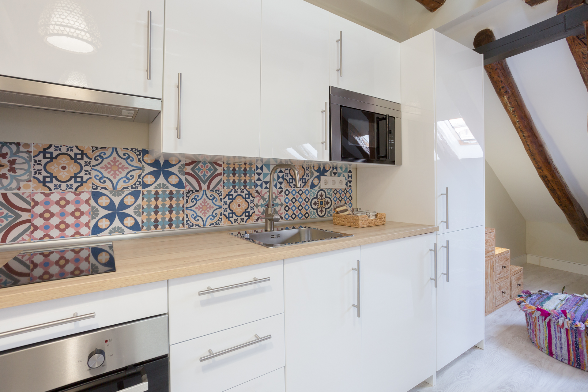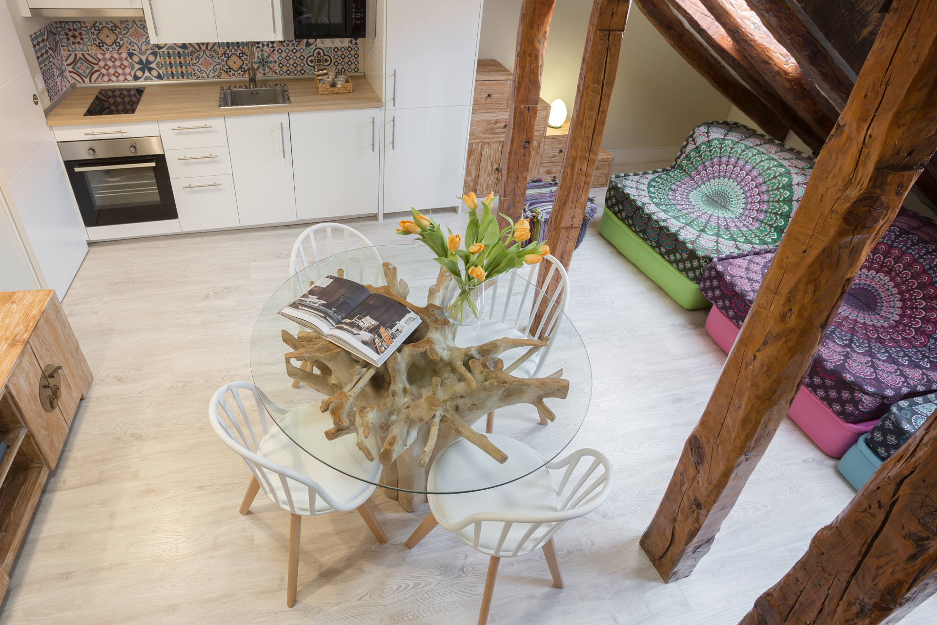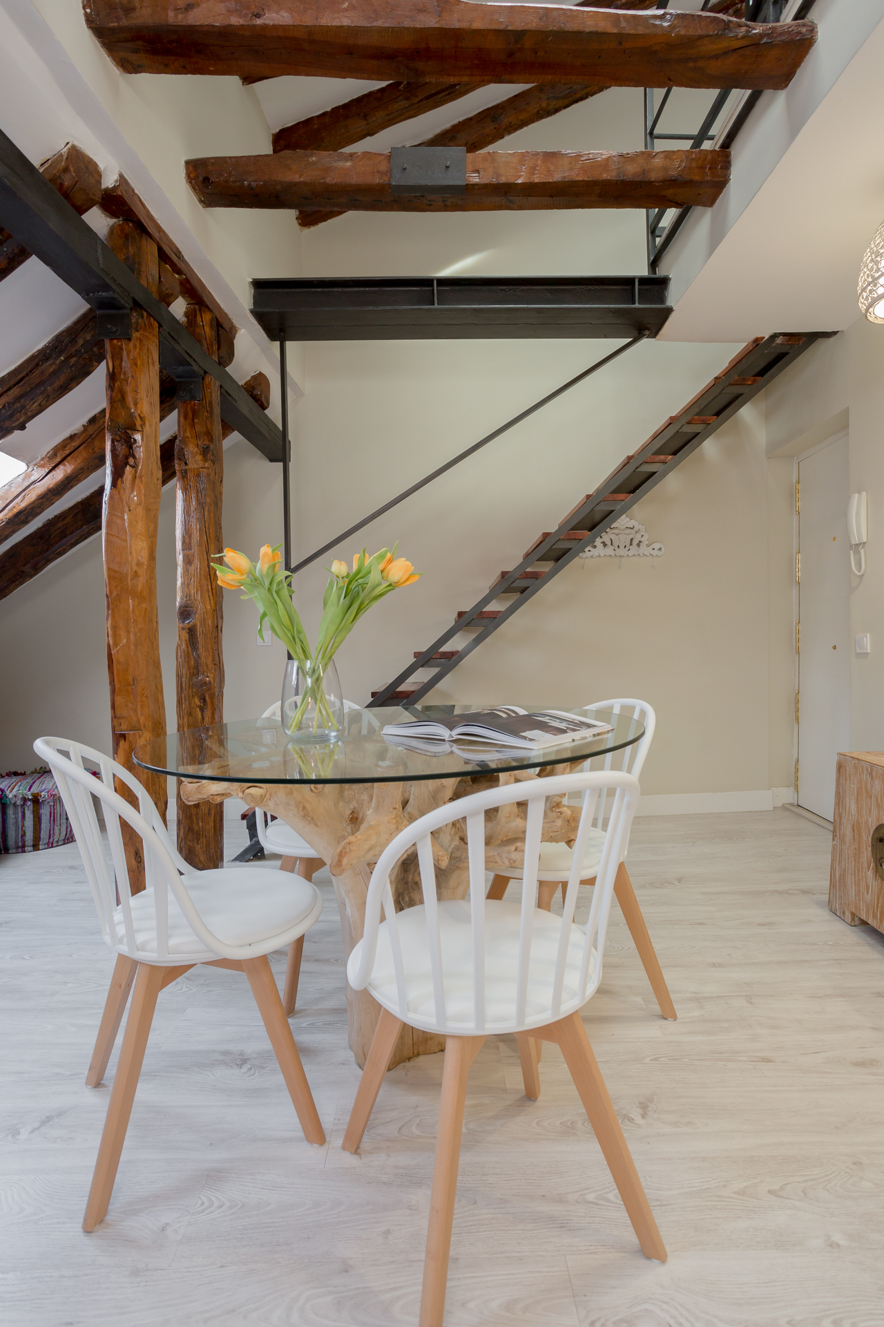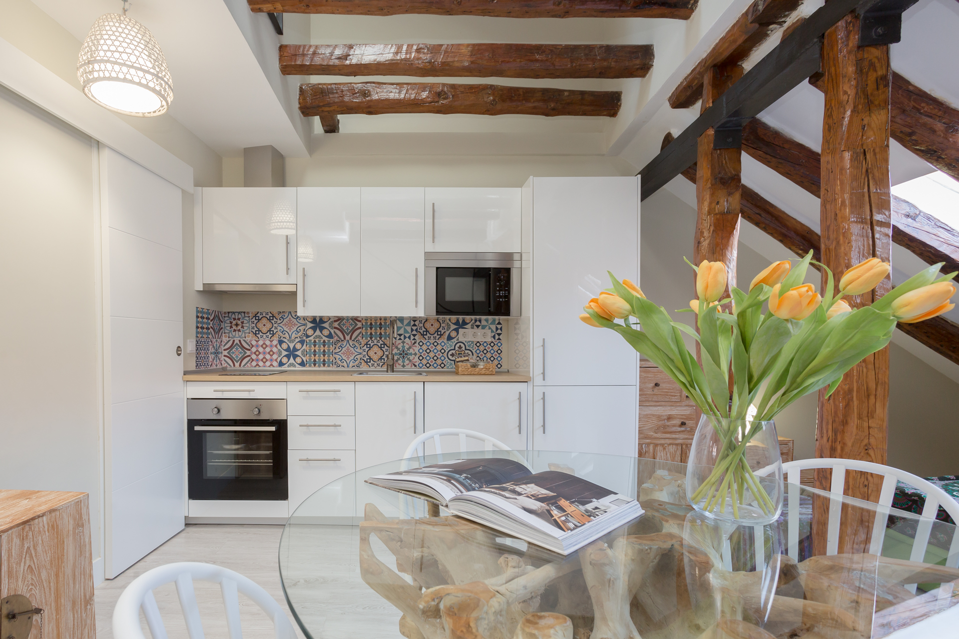 Ubicado en la última planta del edificio, este ático con toques de madera y superficies blancas que dan aires de amplitud y serenidad, está dividido en dos áreas. La zona del salón / comedor, que tiene un sofá de colores y una mesa de comedor con sillas de madera rústicas, que perfectamente contrastan con las vigas que se pueden observar alrededor. Junto a estos, se encuentra la cocina, y que contiene todo lo que pueda necesitar durante su estancia.