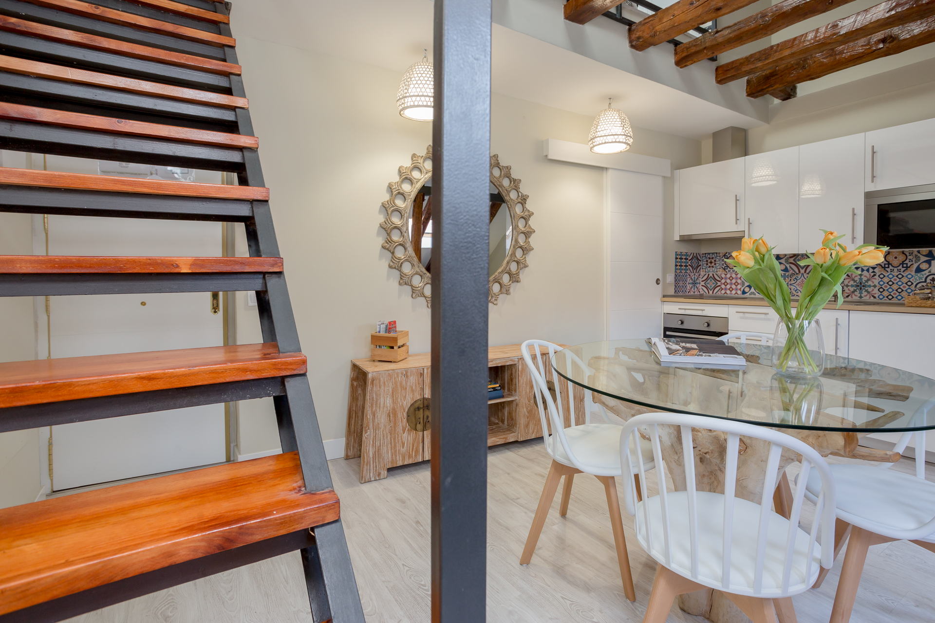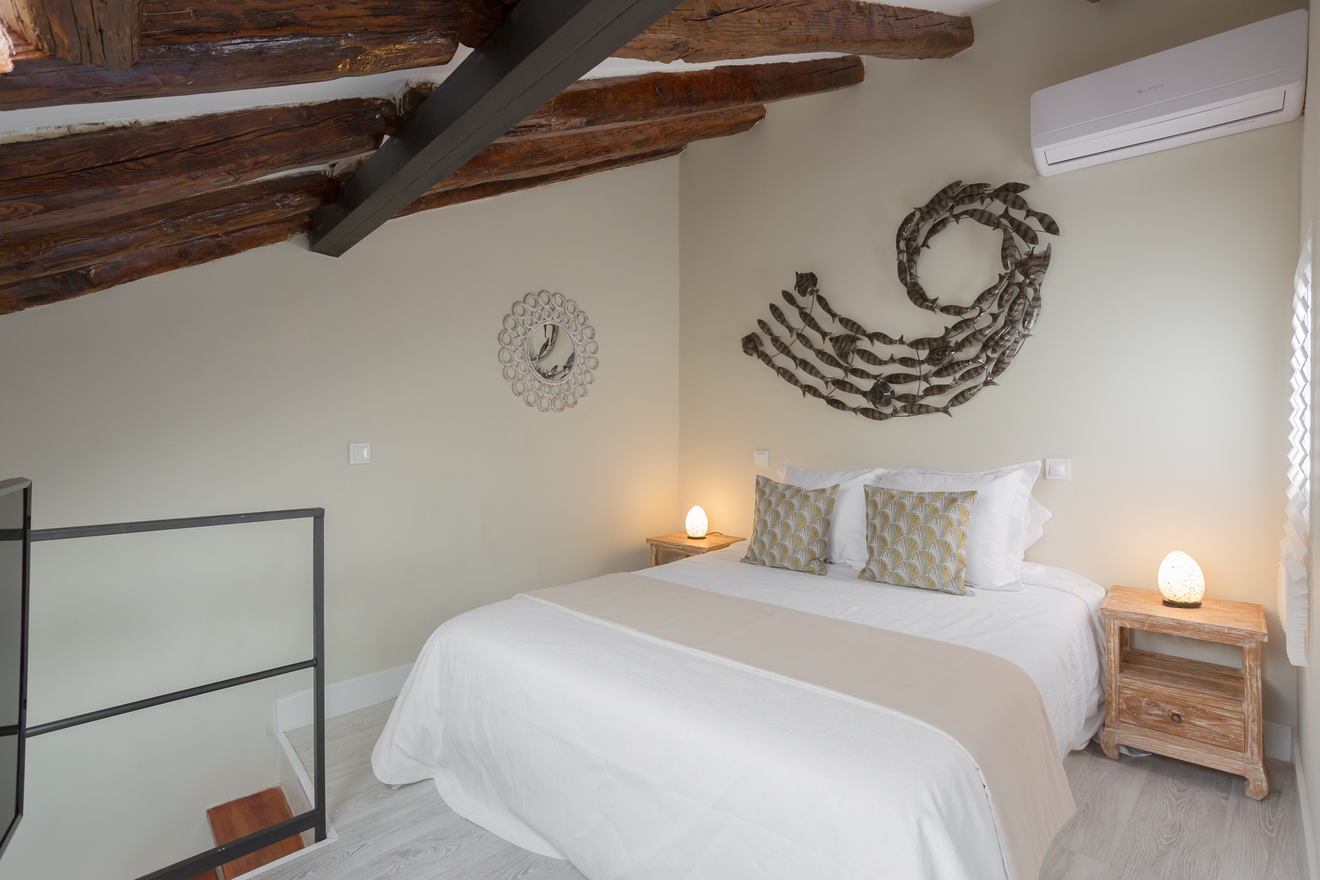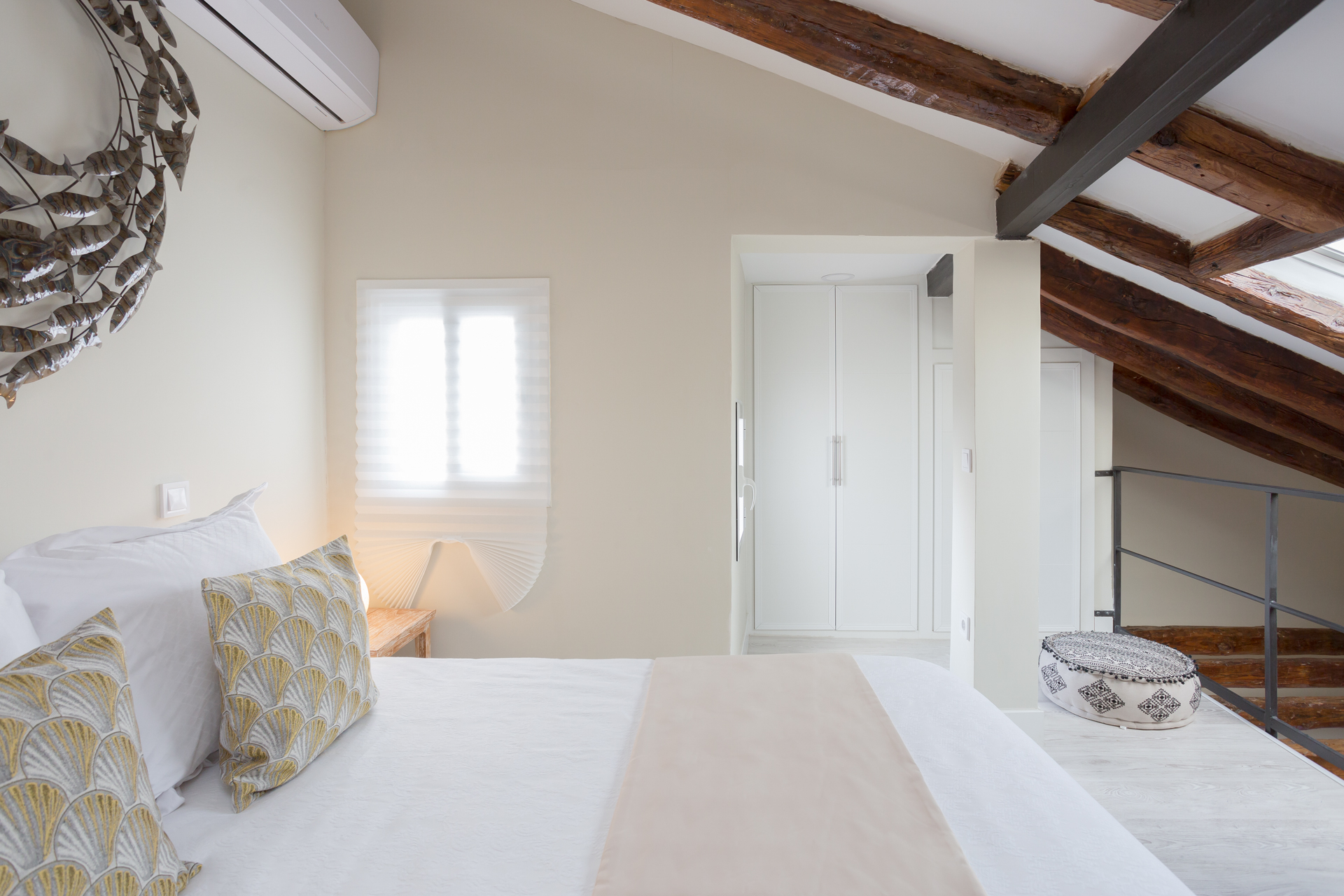 Este maravilloso ático, magníficamente decorado con materiales naturales y muebles exclusivos, brinda un espacio cálido y acogedor, aprovechado y orientado para proporcionar la mejor estancia al huésped.