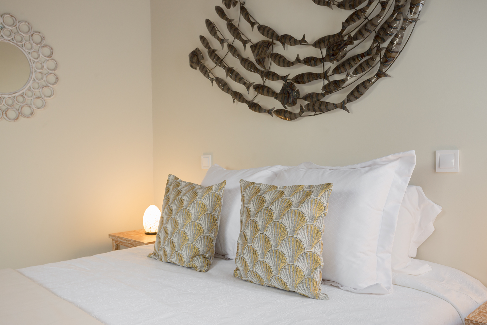 Sábanas confeccionadas con hilo, toallas de baño suaves, almohadas y cojines de alta calidad.