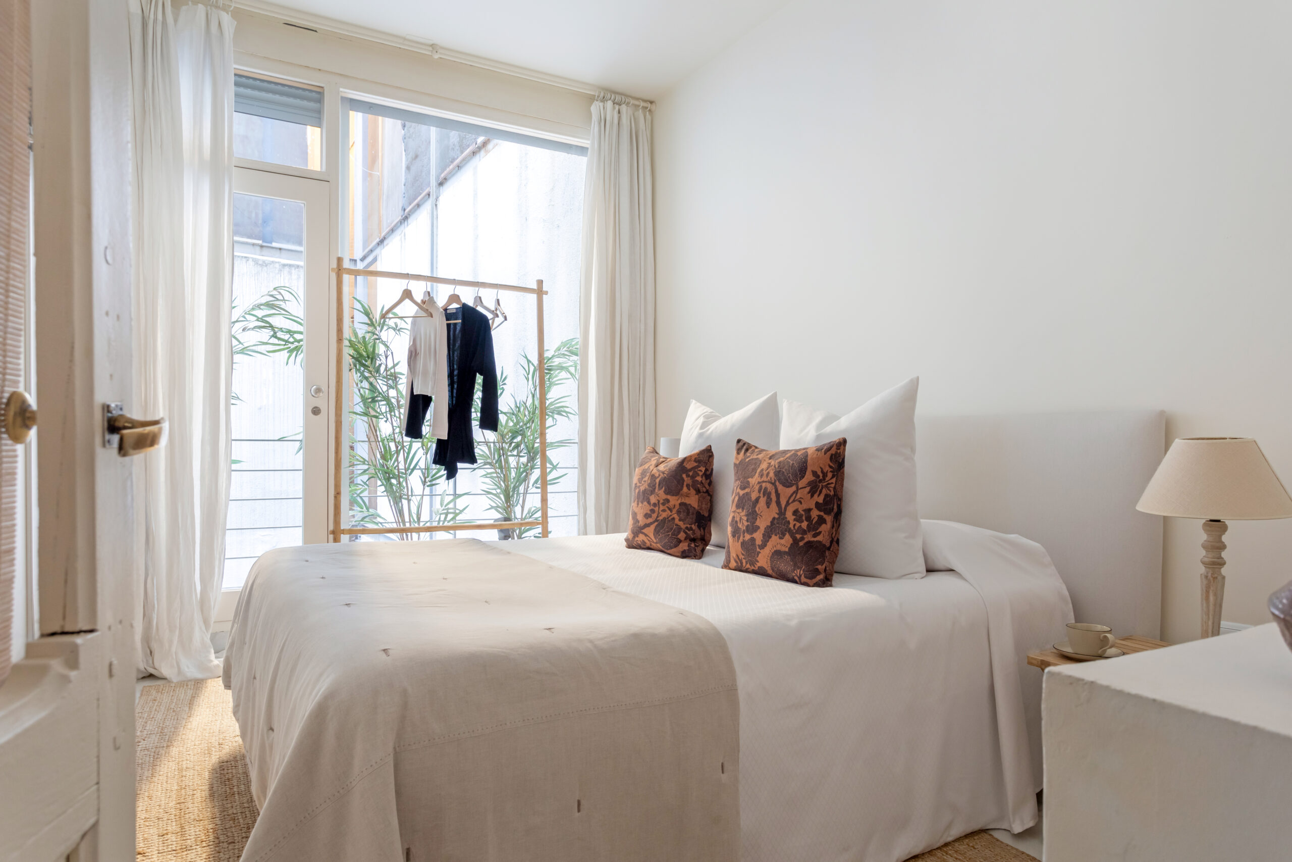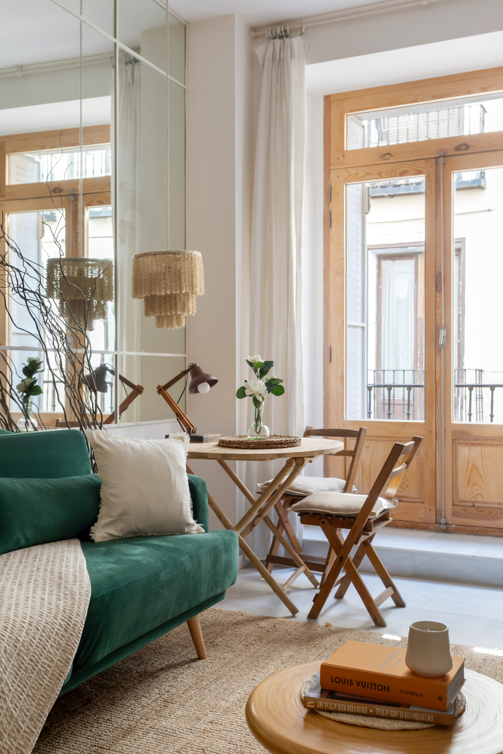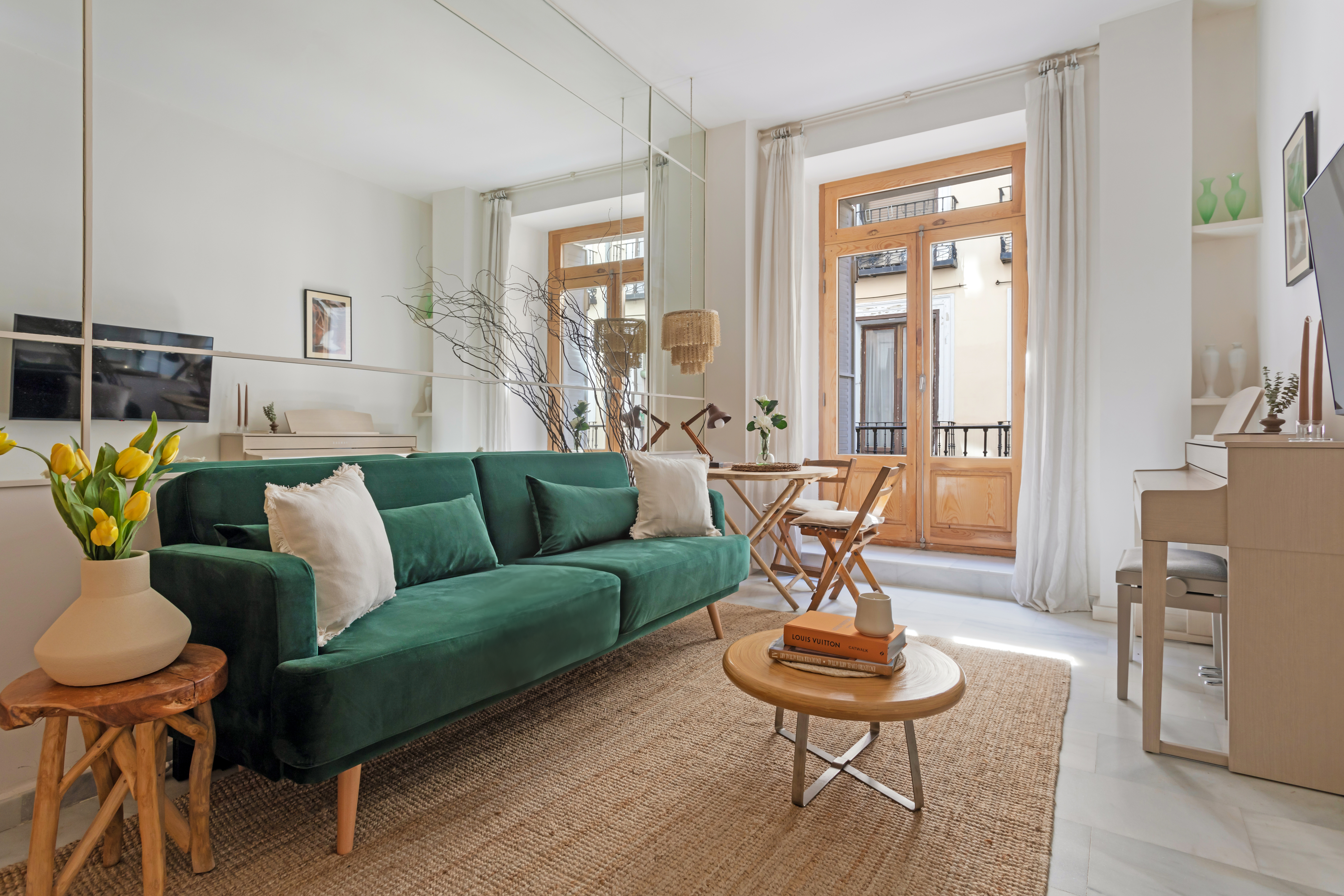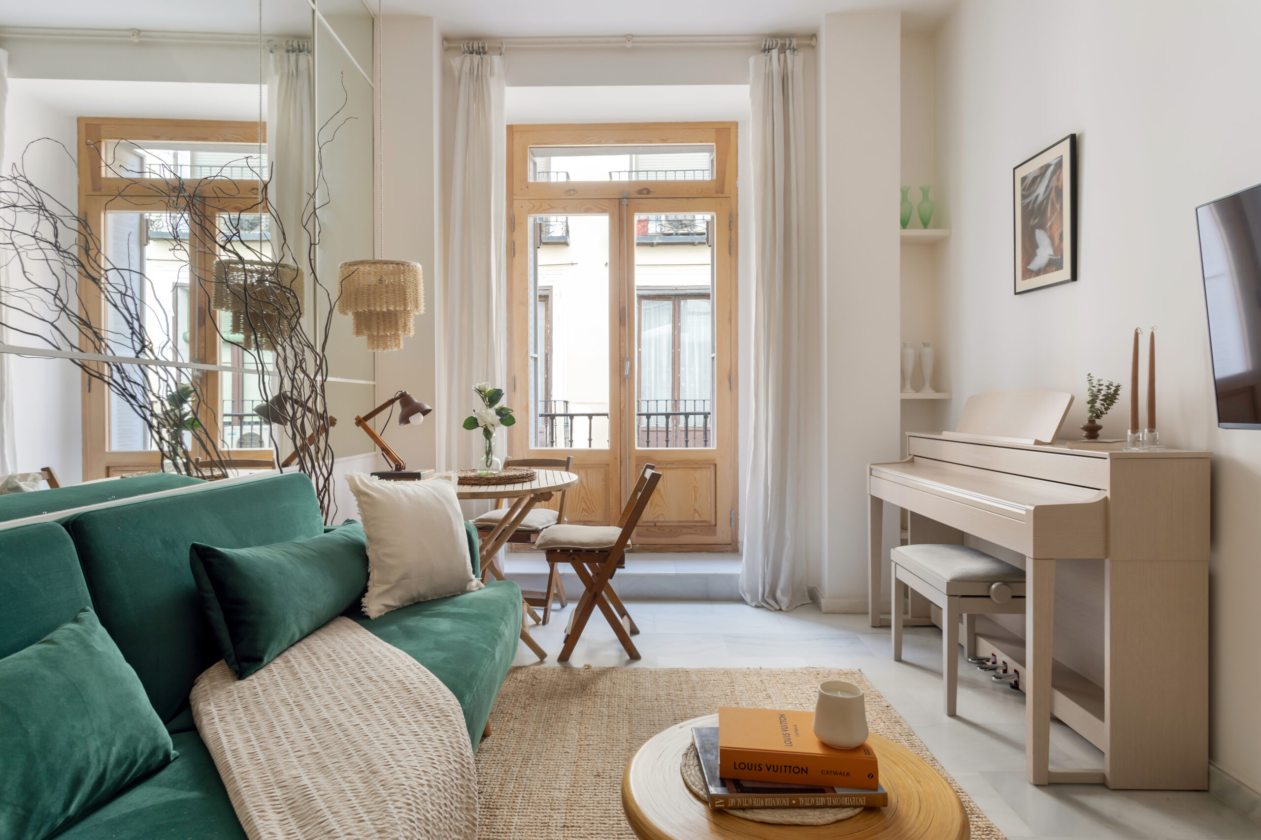 La habitación está equipada con una cómoda cama de matrimonio y un amplio ventanal que proporciona luz natural, así como lámparas de noche que contribuyen a crear un ambiente íntimo y relajante, después de un largo día explorando el corazón de Madrid. El salón, al final del pasillo y con un encantador y recogido balcón con vistas a la calle hará las delicias de los huéspedes por su moderna y sobria decoración, con un sofá cama, tan estético, como cómodo para el perfecto descanso de los huéspedes después un provechoso día por la siempre ajetreada ciudad de Madrid. Pequeñas mesas, un amplio espejo que ocupa casi la totalidad de una de las paredes, un piano y cómodas sillas y butacas completan este maravilloso salón, tan acorde con el piso como con la necesidades de los huéspedes.