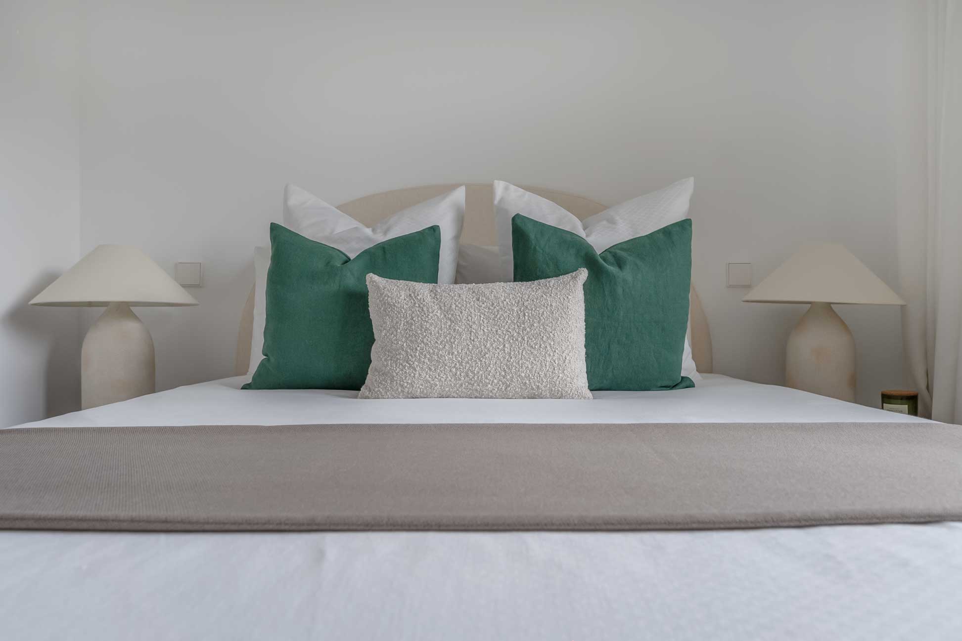 Sábanas confeccionadas con hilo, toallas de baño suaves, almohadas y cojines de alta calidad.