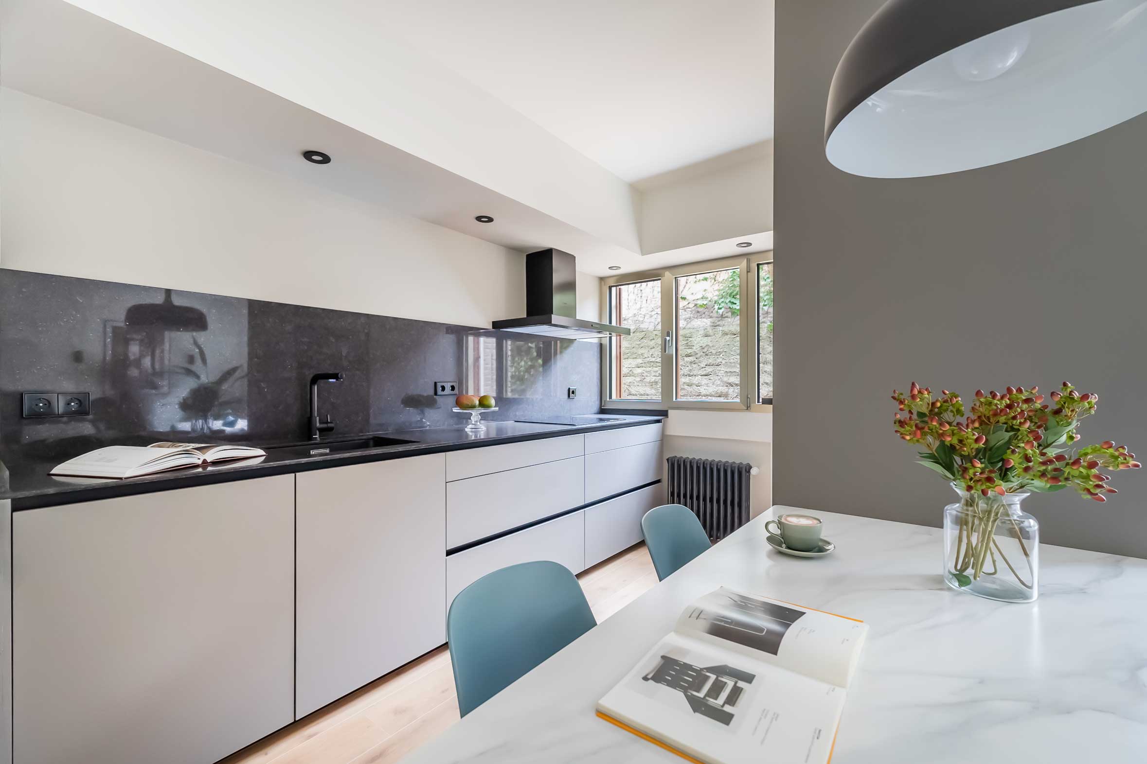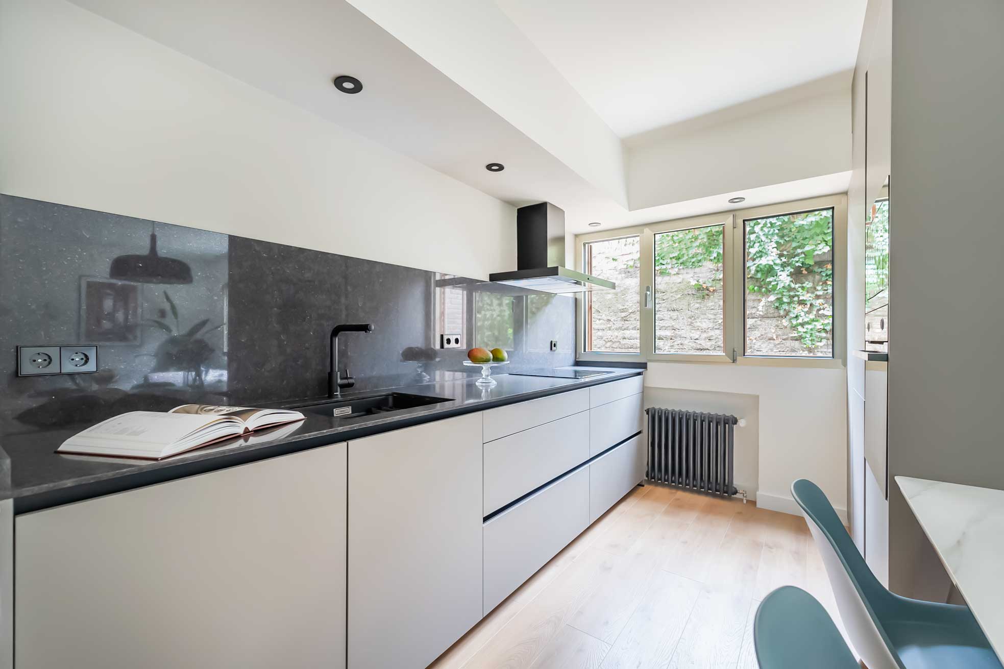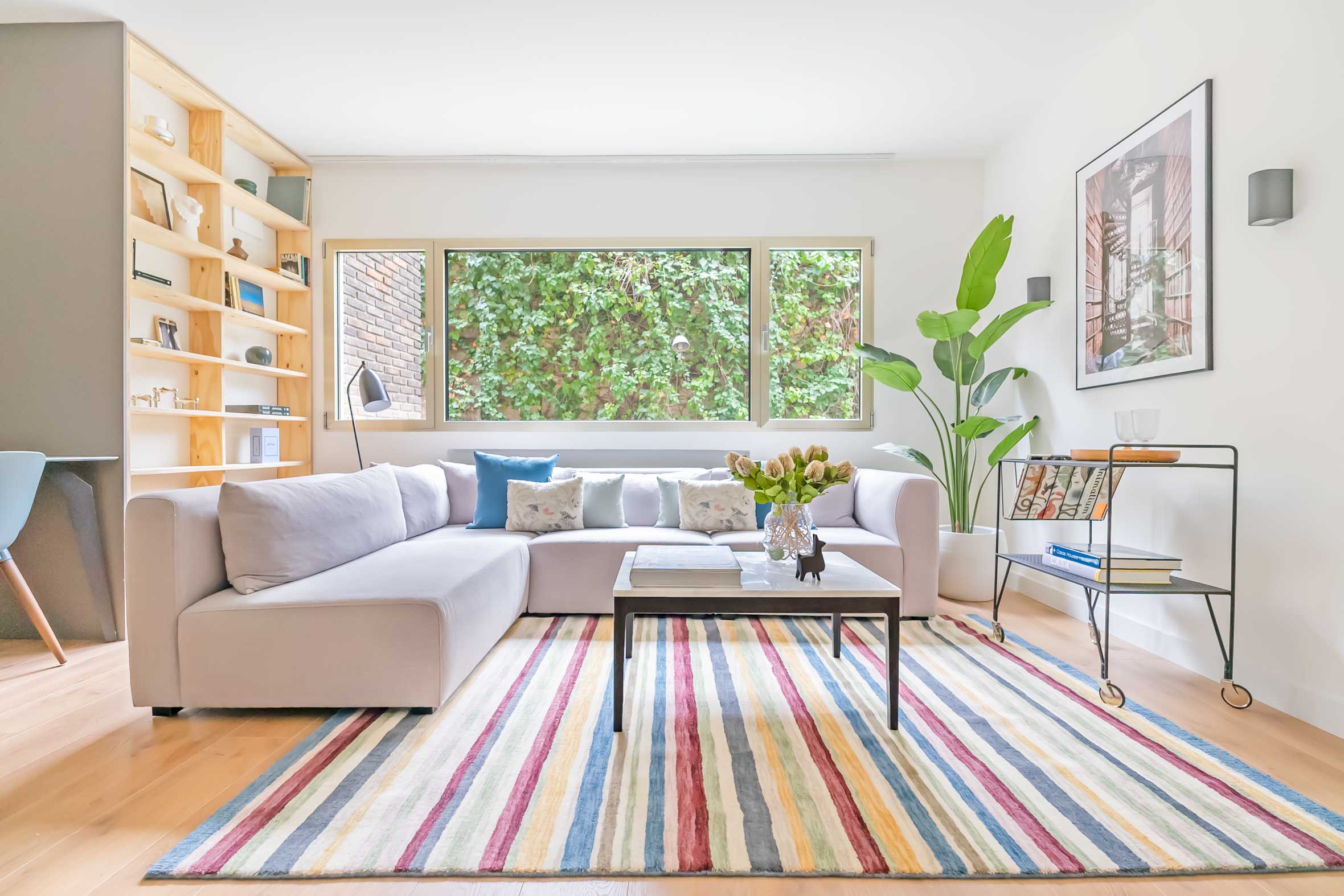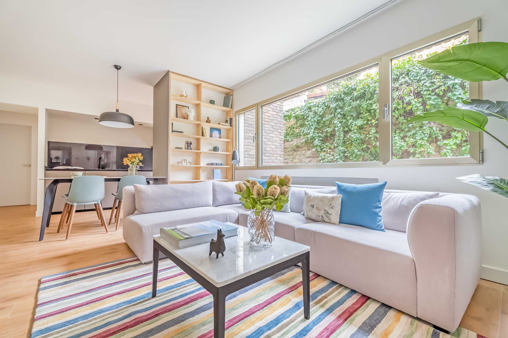 Al entrar, serás recibido por una cocina americana moderna y funcional, perfectamente integrada con un salón decorado en tonos vivos que aportan calidez y personalidad. Las grandes ventanas del apartamento inundan el espacio de luz natural, creando un ambiente fresco y relajante en plena ciudad.