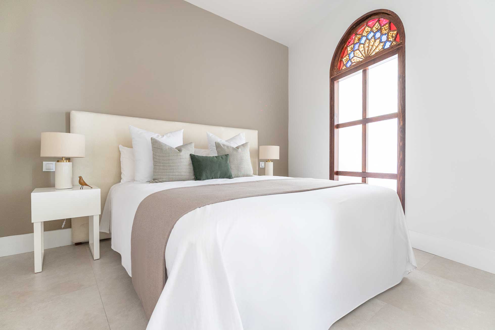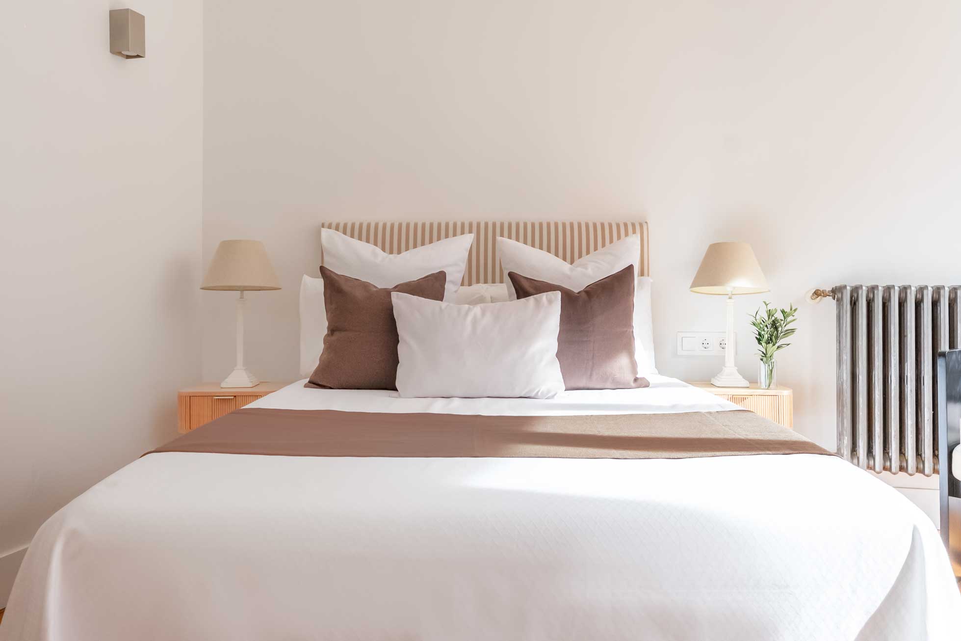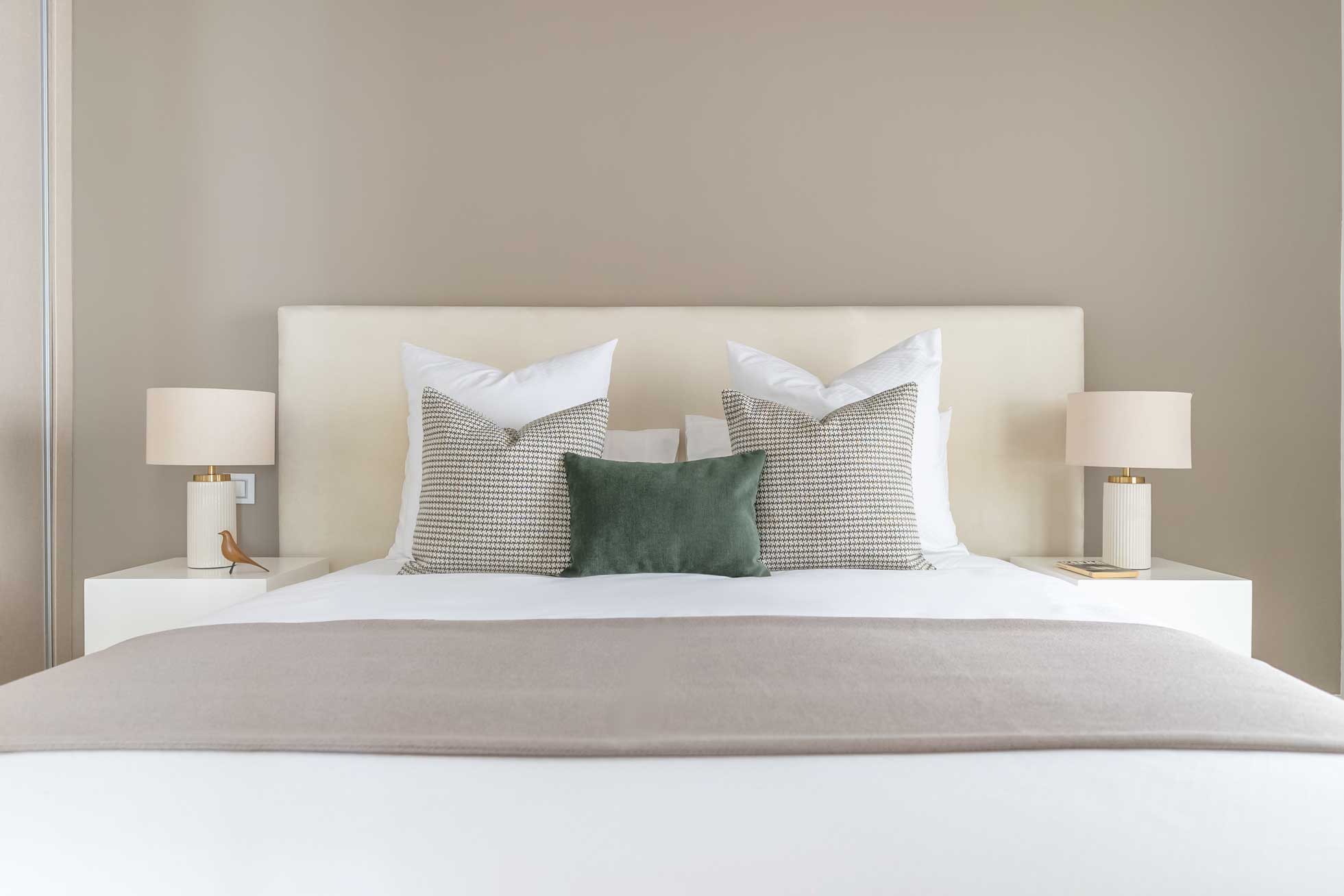 Sábanas confeccionadas con hilo, toallas de baño suaves, almohadas y cojines de alta calidad.