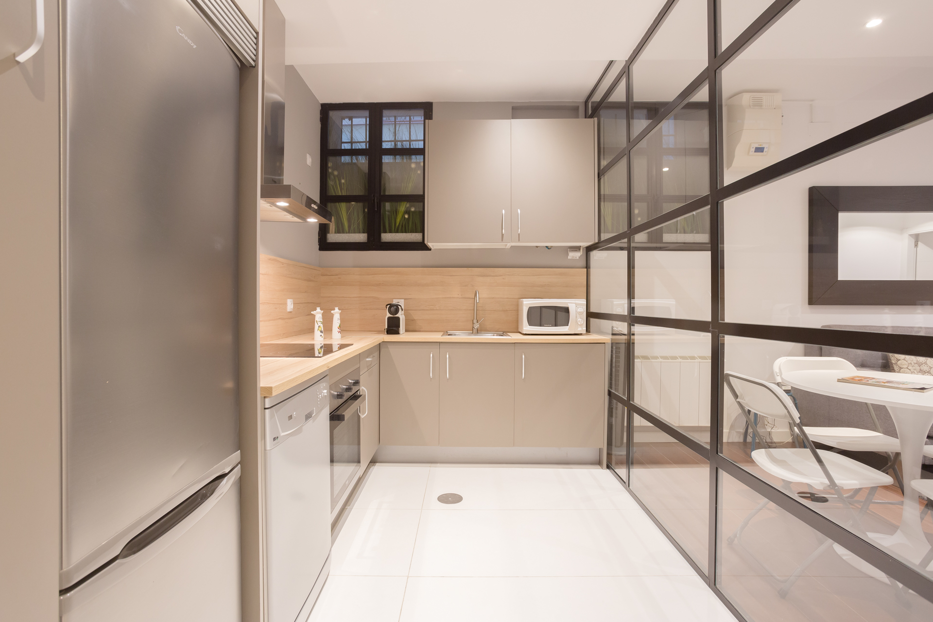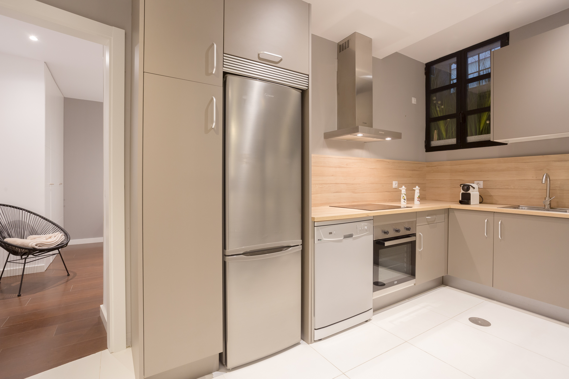 Separada del salón con una mampara de cristal podemos encontrar la cocina, muy amplia y con todo lo necesario para una placentera estancia. A destacar debemos mencionar su plancha eléctrica, su cafetera Nespresso entre otros servicios que le dan un plus a la vivienda. En la cocina podemos encontrar una ventana superior que da al patio interior.