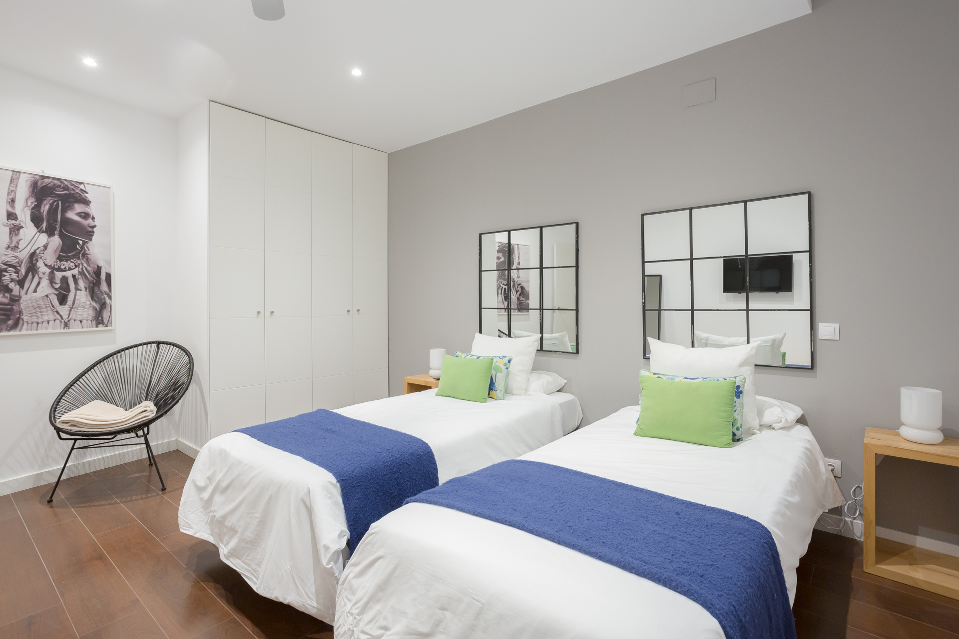 En la parte izquierda del salón podemos encontrar un amplio dormitorio que tiene una cama de matrimonio y amplio espacio. En la parte derecha del salón podemos encontrar otro dormitorio con dos camas individuales y armario empotrado.