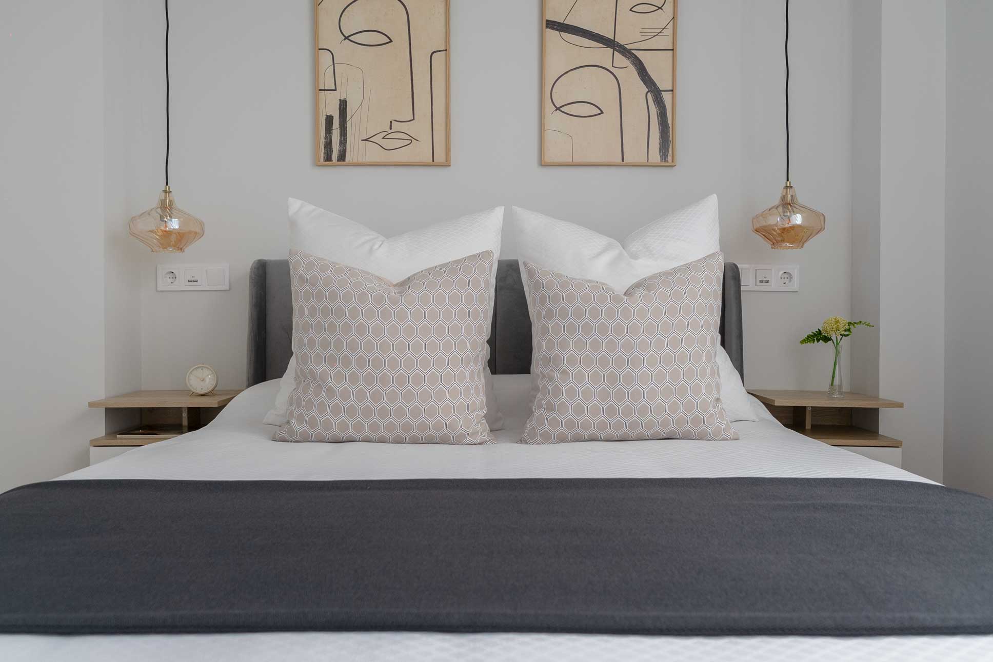 Sábanas confeccionadas con hilo, toallas de baño suaves, almohadas y cojines de alta calidad.