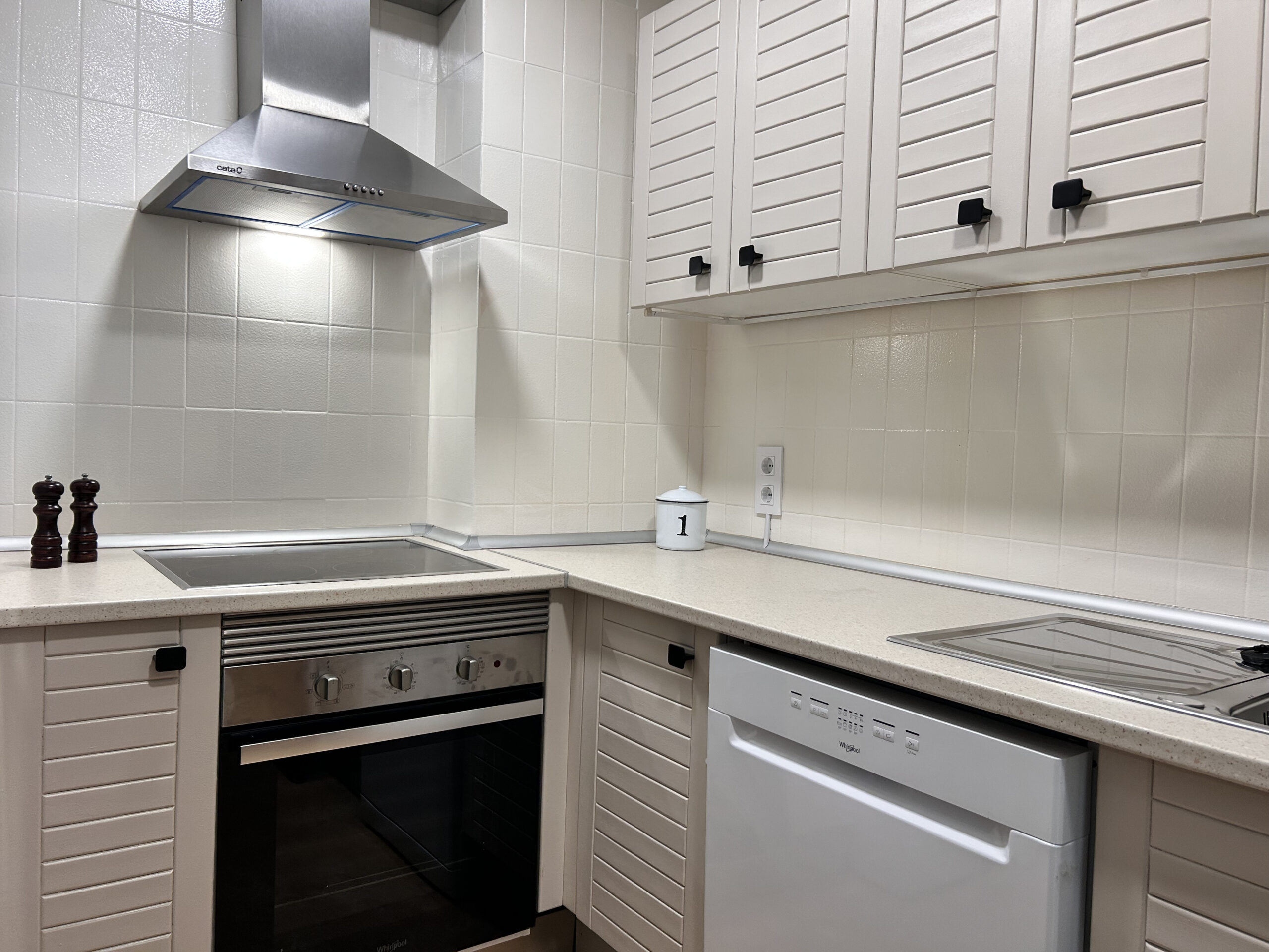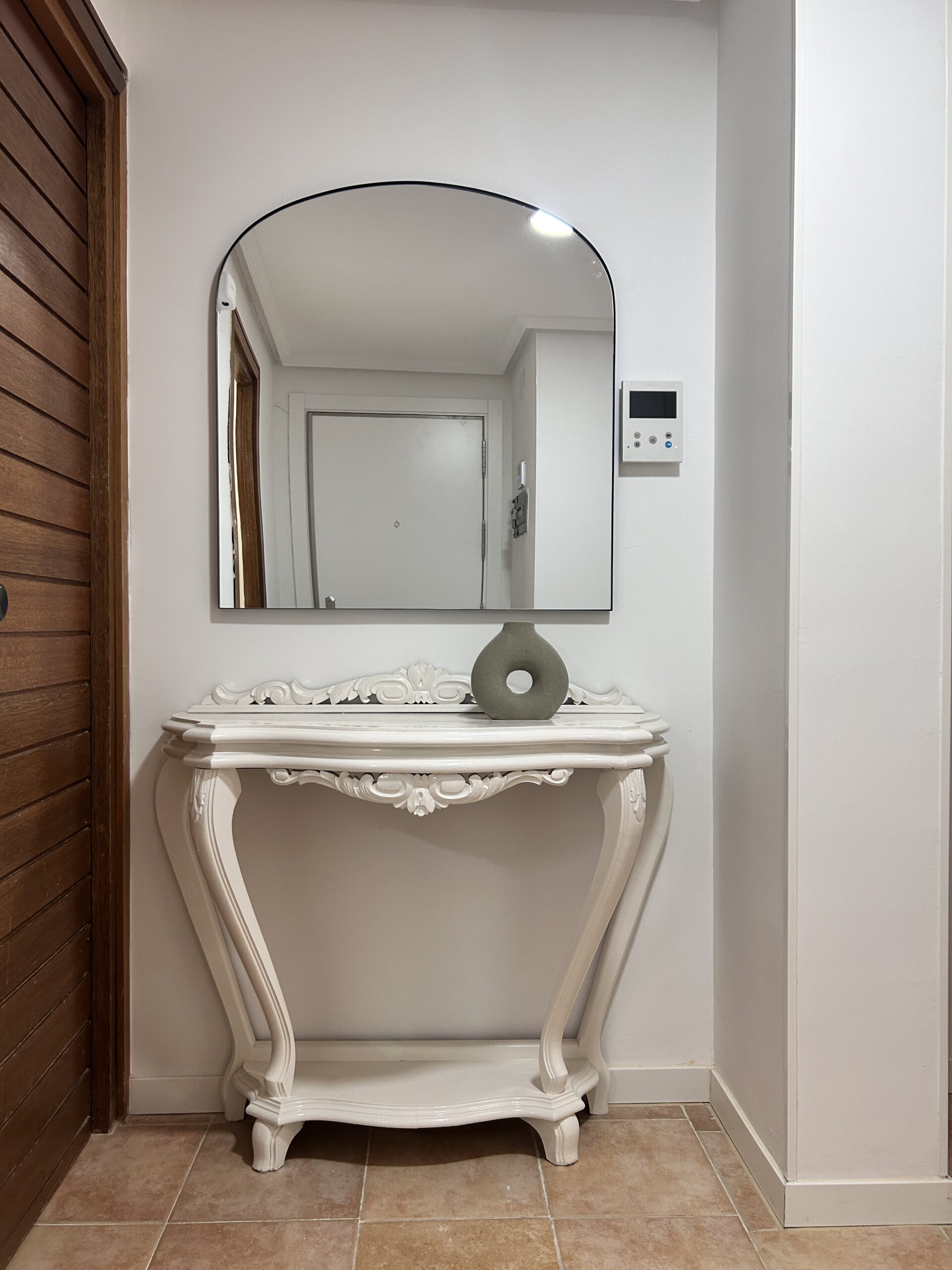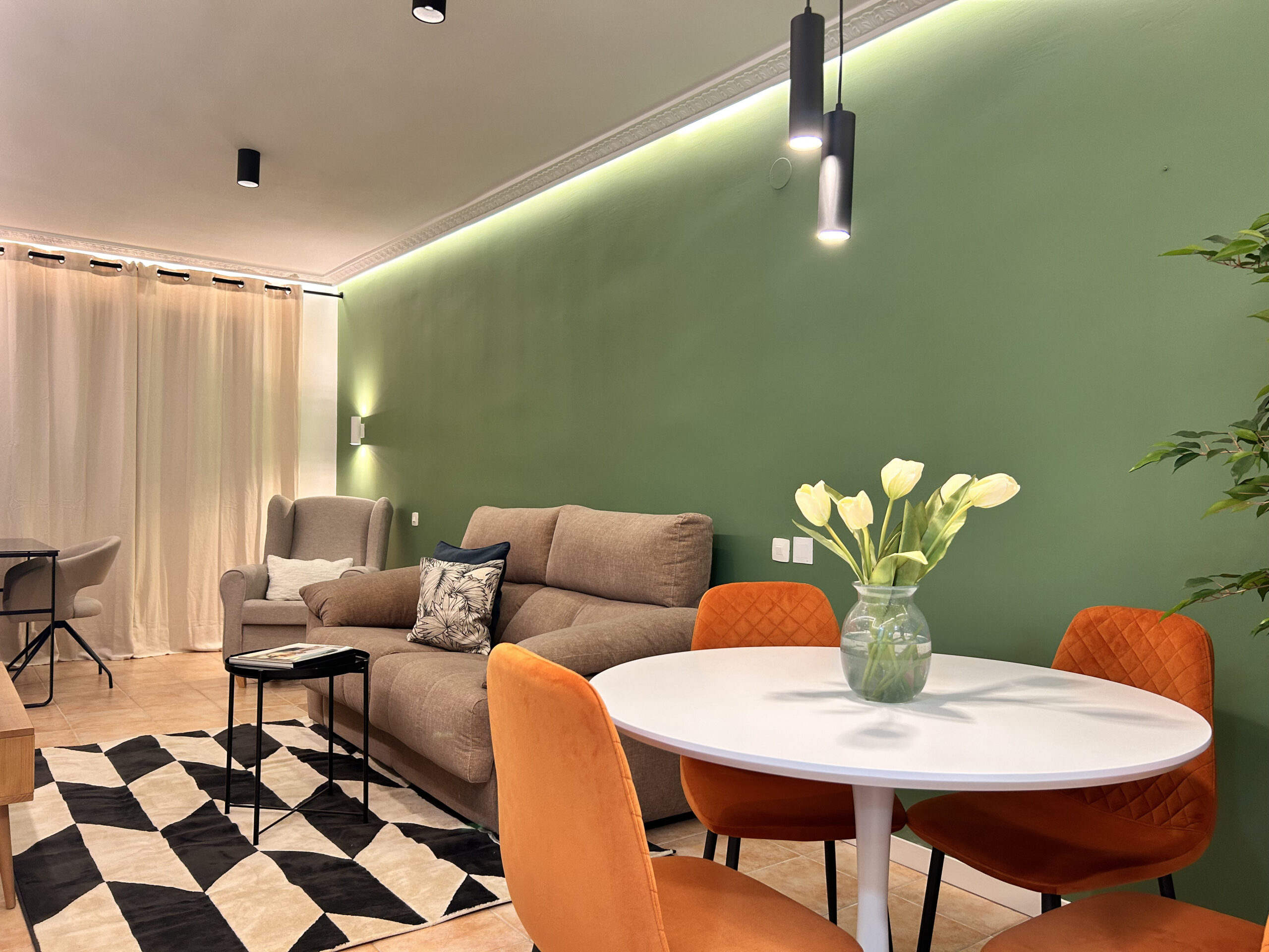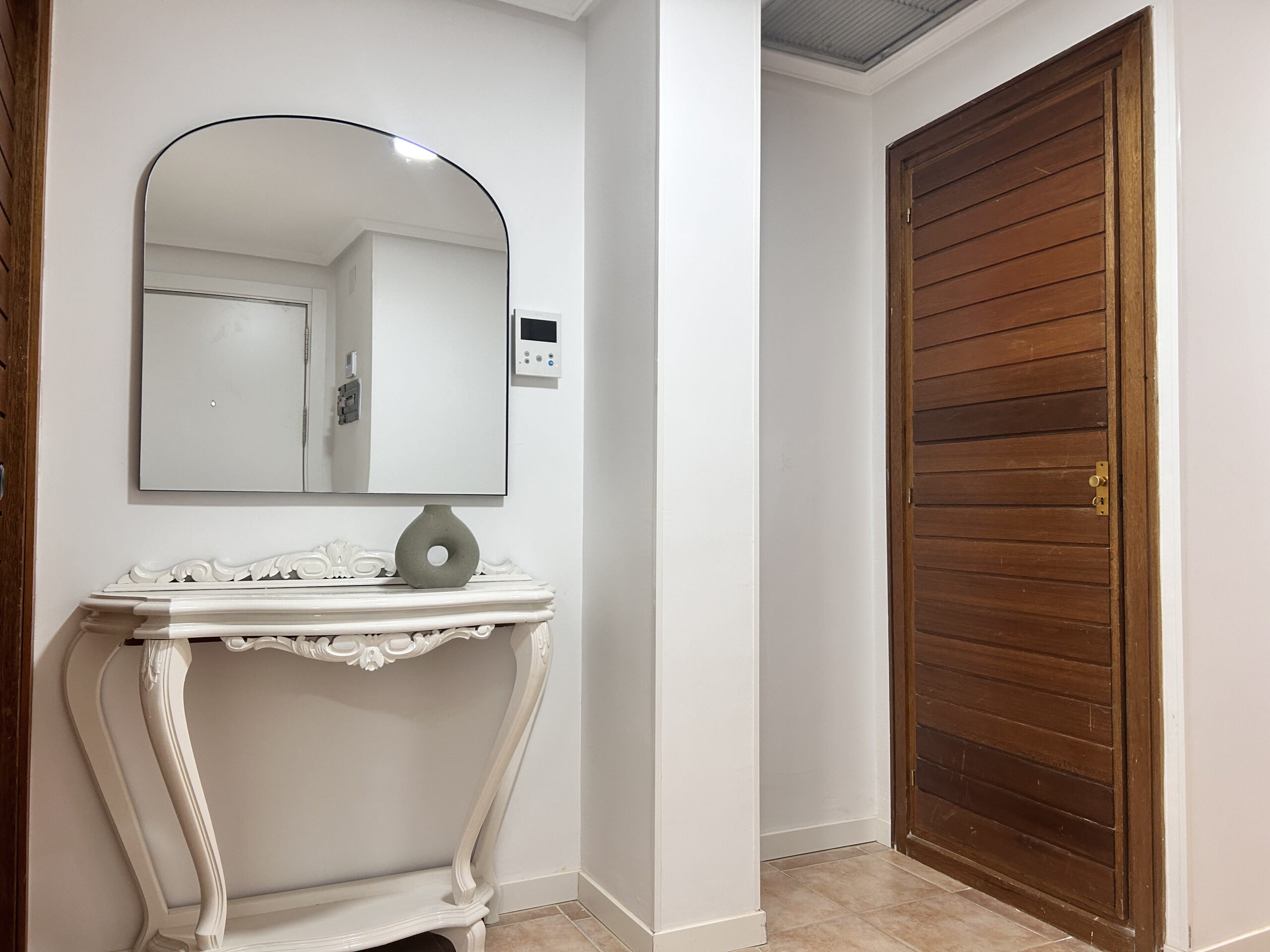 Este apartamento recién reformado, tiene una espaciosa entrada con espacio de almacenaje y acceso al baño completo y al aseo. La cocina, semi abierta, da paso al comedor y la sala de estar, creando un ambiente luminoso.